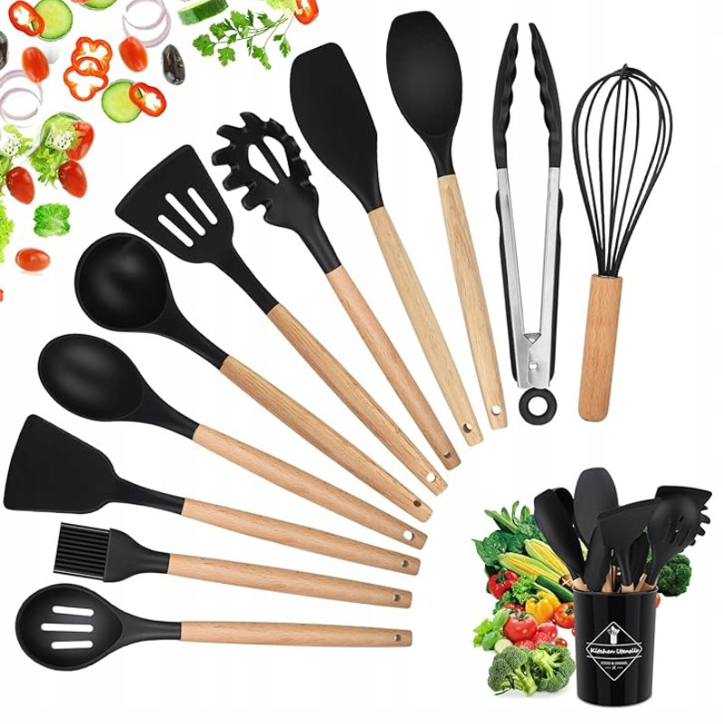 Silikonowy zestaw przyborów kuchennych o ergonomicznym kształcie to niezbędnik w każdej kuchni. Silikon to nietoksyczny materiał, odporny na wysoką temperaturę, co czyni go bezpiecznym wyborem. Zestaw posiada aż 12 elementów, które będą niezbędne w twojej kuchni i przydadzą się do przyrządzania każdej potrawy.